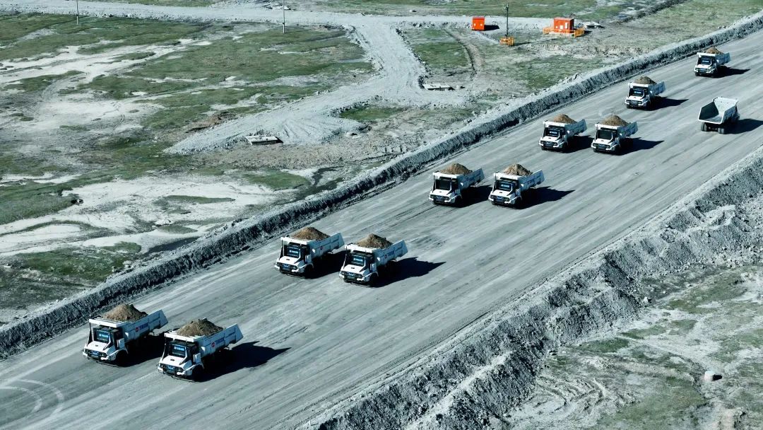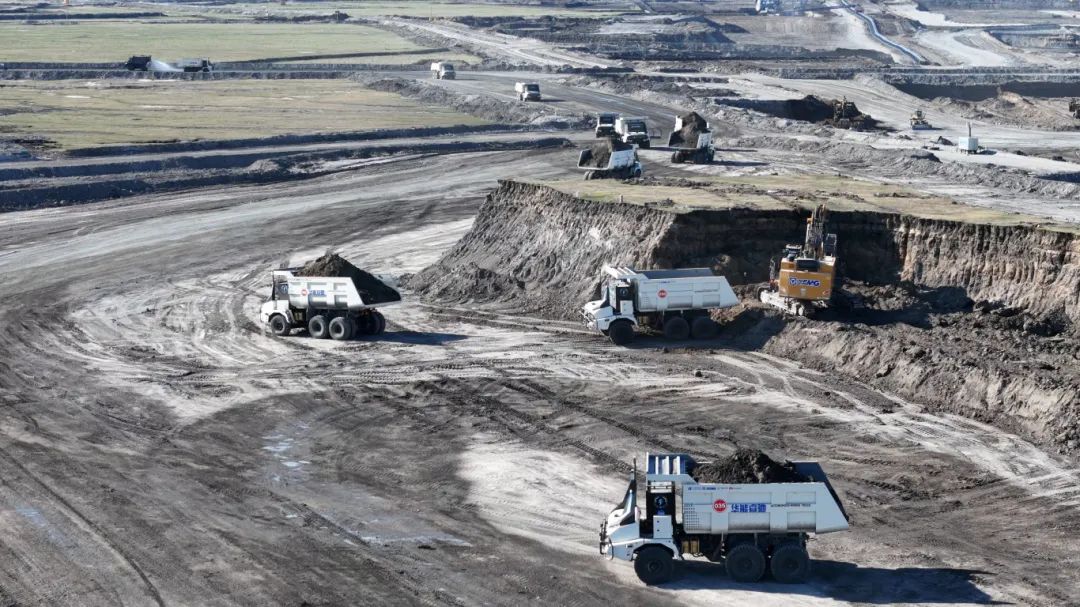 在廣袤的大草原上,華能與徐工合作開(kāi)發(fā)的百臺(tái)睿馳無(wú)人電動(dòng)礦卡馳騁在伊敏露天煤礦。