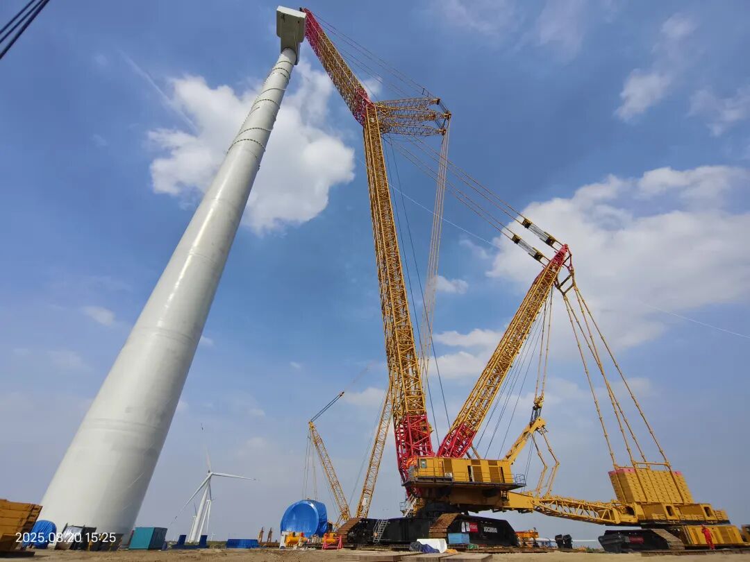 面對施工難題,項目團隊創新采用樁基加固工藝增強地基穩定性,啟用全球最大的4000噸級履帶式起重機——徐工XGC88000承擔吊裝任務,通過“地面預調平+高空精準協同”系統方案,最終實現重達千噸的機艙平穩就位。