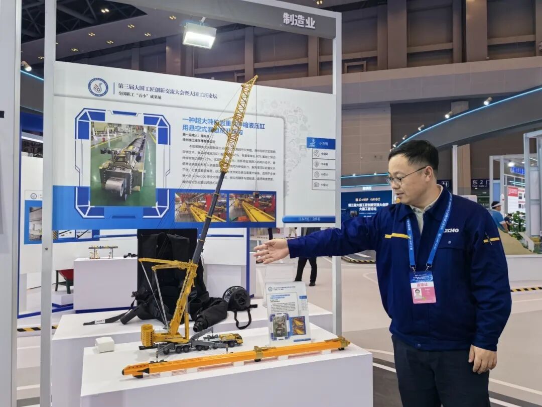 以匠心致創(chuàng)新,徐工人在攻克核心難題上從不缺席。徐工液壓事業(yè)部陳向兵完成的“一種超大噸位起重機伸縮液壓缸用懸空式滑道爬升結構”亮相全國總工會“五小”成果展區(qū)。