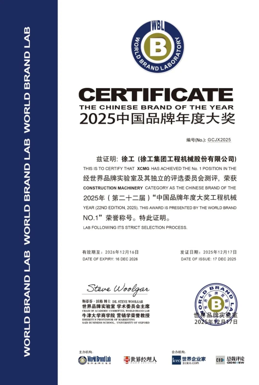 2025年“中國品牌年度大獎”評選在“世界經理人峰會”上揭曉。這項被譽為“中國品牌奧斯卡”的權威獎項,由業界權威機構世界品牌實驗室在中國香港頒發。徐工一舉榮獲 “中國品牌年度大獎工程機械NO.1” 及 “中國綠色生態十大影響力品牌” 雙項殊榮。