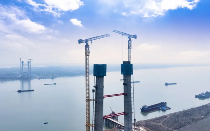 大橋主墩建設是整座大橋順利完工的“壓艙石”,大橋北主塔高度211.75米,采用主塔鋼筋部品整體吊裝。作為徐工超大塔中的明星產品,兩臺徐工XGT2230A-100S扛起大橋北主塔的施工重任。