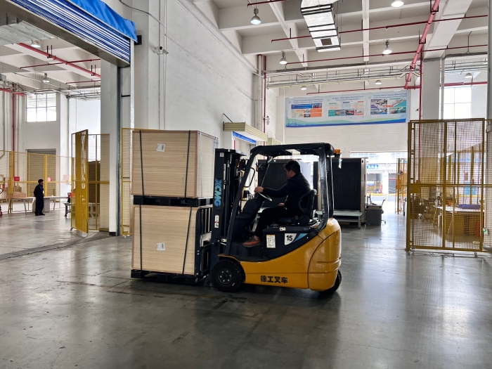 在華南區某大型保稅倉內,十幾臺徐工三支點系列叉車正在進行緊張的搬運工作,