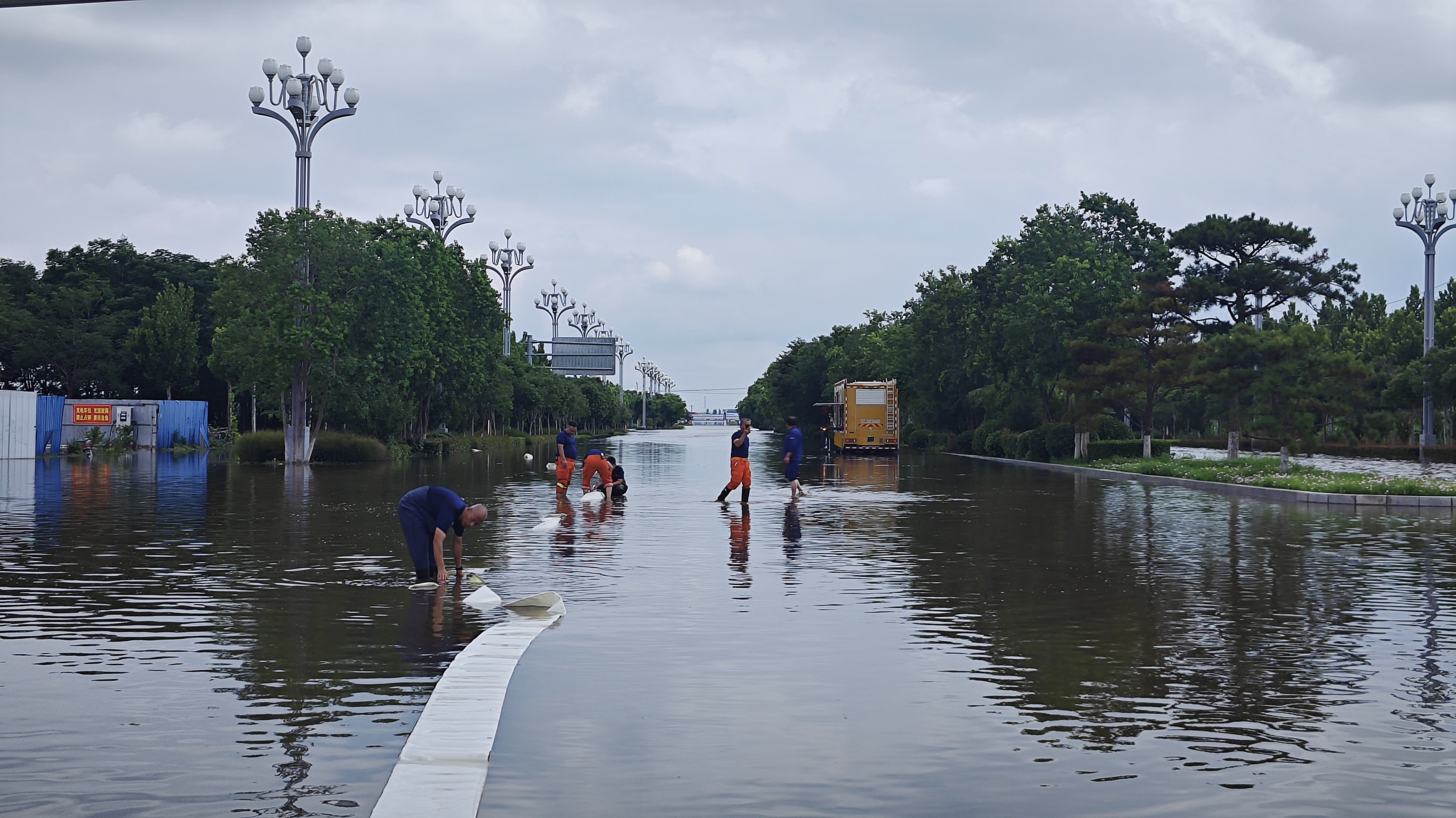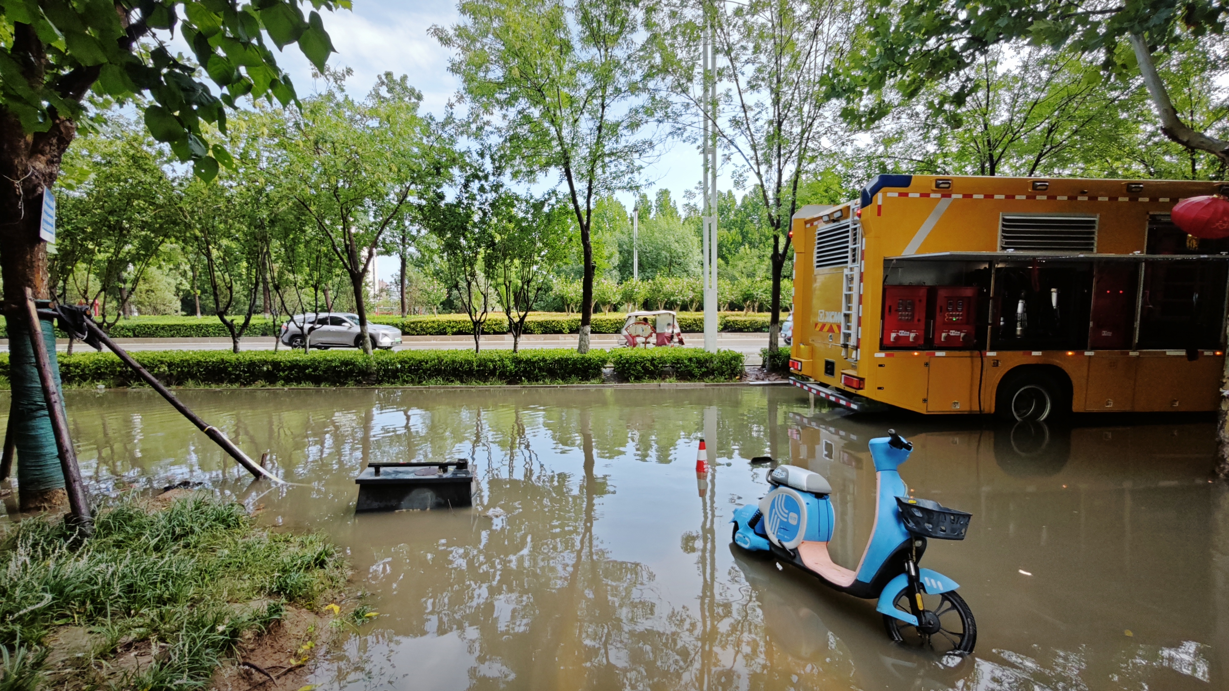 華商大道同屬商丘市睢陽(yáng)區(qū),此處靠近河堤,周邊道路積水均向此處轉(zhuǎn)移,交通主干道被積水淹沒(méi),影響城市正常通行。