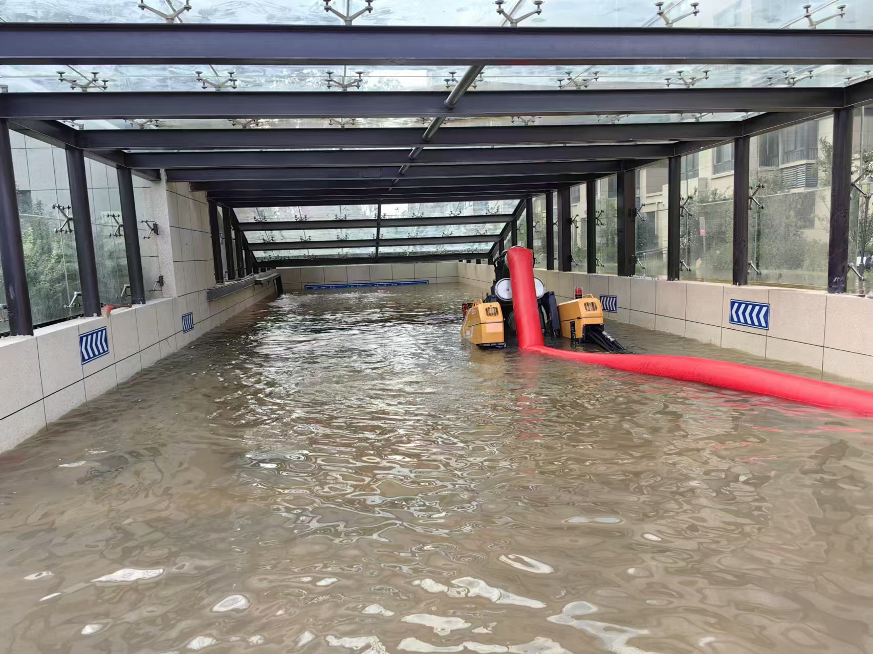 到達現場后,救援隊立即開始鋪設水帶、檢查管路,憑借子母式排澇車可實現遠程分離控制的功能,救援人員將PS50F停至地下車庫入口處,鋪設240米超長水帶,遙控子車探入斜坡30余米,水泵沒入積水進行抽排水。連續工作40小時后,PS50F排除積水超80000m3,內澇隱患得到有效控制,獲得現場居民一致點贊。