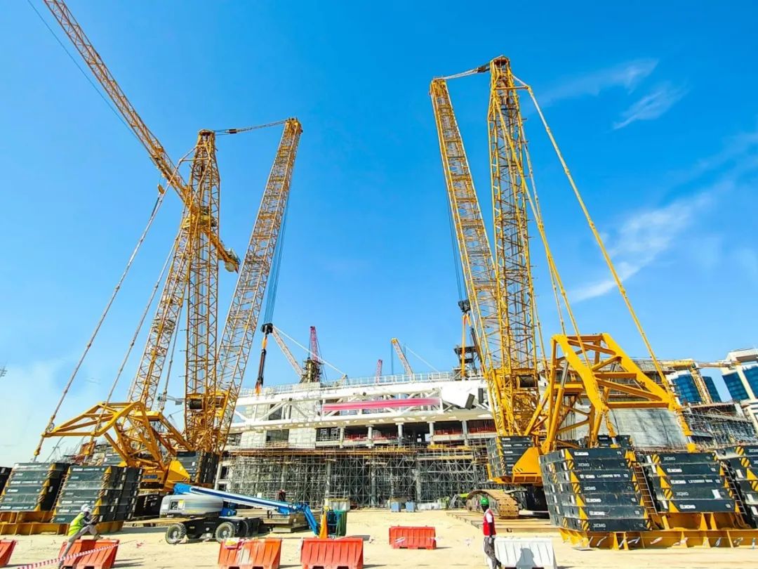 萬里之外的中東沙漠,2034年世界杯主場館建設現場,XGC15000A與XGC12000領銜組成"鋼鐵艦隊"。