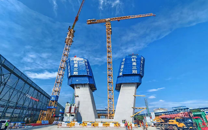 在杭甬復(fù)線(xiàn)寧波三期甬江特大橋施工現(xiàn)場(chǎng),1臺(tái)徐工XGT3000-120S、2臺(tái)XGT3000-100S如鋼鐵巨人伸展手臂,正加緊進(jìn)行著鋼筋部品的吊裝,助力3座大橋主塔以平均每天1米的速度向云端挺進(jìn),贏(yíng)得施工方“技術(shù)先進(jìn)、安全可靠、吊裝能力強(qiáng)、操作平穩(wěn)、智能化水平高、施工效益顯著”的高度肯定。