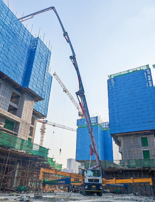 在高鐵新區超高層項目中,258 米地標建筑核心筒澆筑是關鍵環節,對泵車的覆蓋能力和精準度要求嚴苛。徐工72米泵車以71.1 米有效長度,輕松完成了這一艱巨任務。智能防傾翻技術、智能臂架技術等充分展現了 “中國高度” 背后的精準實力。