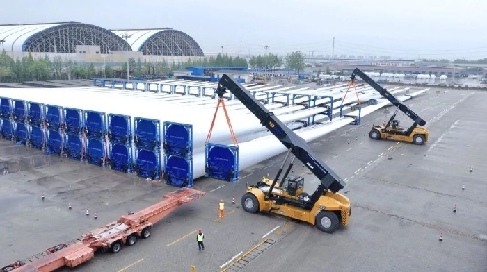 目前,XCS70KS風電正面吊已在揚州港順利完成多次大型風電部件裝卸任務,其穩定高效的性能成為長三角地區智慧口岸建設的標桿力作。該裝備的成功應用,不僅全面提升了港口運營質效,也為全國港口的智能化升級提供了可復制、可推廣的徐工-揚州港樣板。