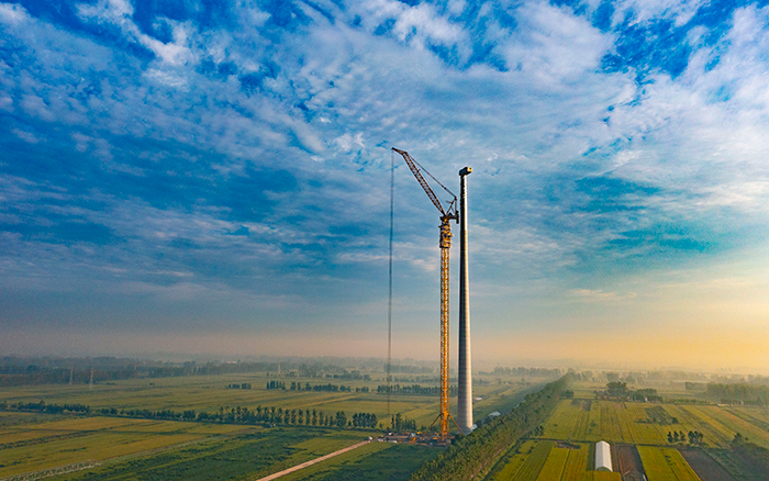 郯城風(fēng)場此次吊裝的風(fēng)機創(chuàng)下區(qū)域高度紀(jì)錄,采用140米混塔+45 米鋼塔結(jié)構(gòu),葉輪直徑達 220 米,僅機艙與葉輪總重就超 200 噸。185 米的高空作業(yè),風(fēng)力擾動、部件對接精度等因素對吊裝設(shè)備的性能提出了極致考驗,毫厘之差便可能影響整座風(fēng)場的并網(wǎng)進度。